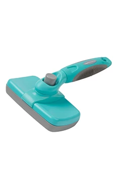 The Groomer Essentials Self Cleaning Slicker Brush is designed with rounded, scratch free pins to safely and gently remove tangles and excess fur. The non-slip rubber grip helps to reduce fatigue. One click of a button and the pins retract allowing you to simply wipe away the excess fur.